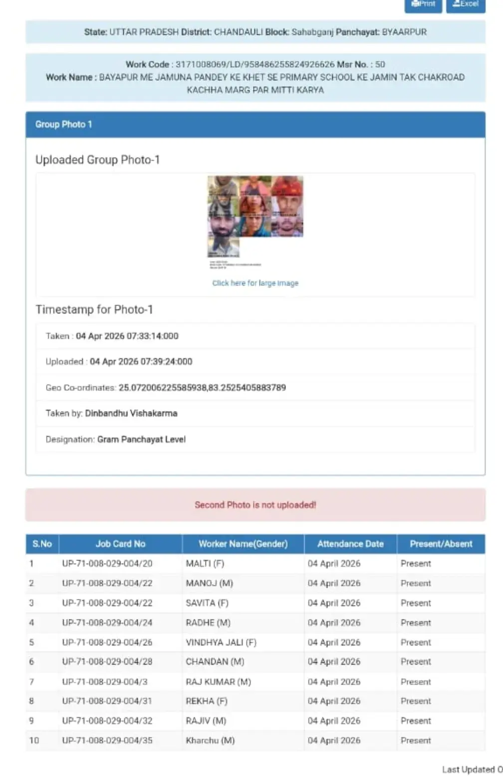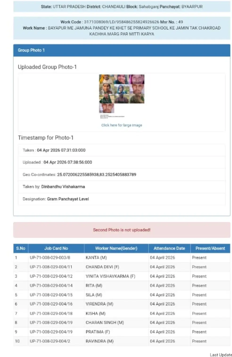 मामले में एक और गंभीर लापरवाही यह सामने आई है कि रिकॉर्ड में “सेकंड फोटो नॉट अपलोडेड” दर्शाया गया है। मनरेगा के नियमों के अनुसार कार्यस्थल की दो फोटो अपलोड करना अनिवार्य होता है, ताकि पारदर्शिता बनी रहे। ऐसे में नियमों की अनदेखी भी साफ तौर पर दिखाई दे रही है।