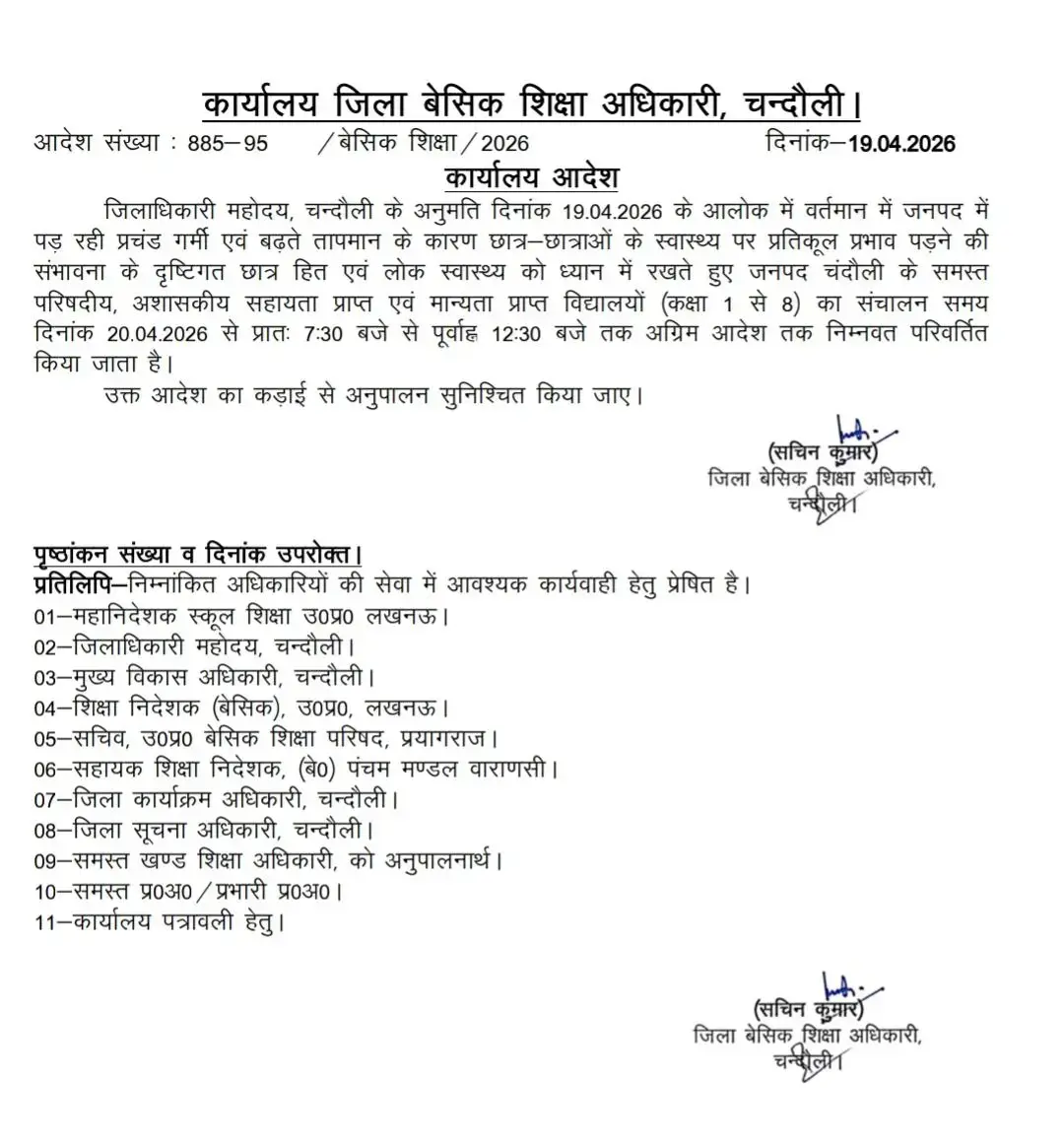 चंदौली में स्कूलों का बदला समय, अब सुबह 7:30 से 12:30 तक चलेंगे विद्यालय